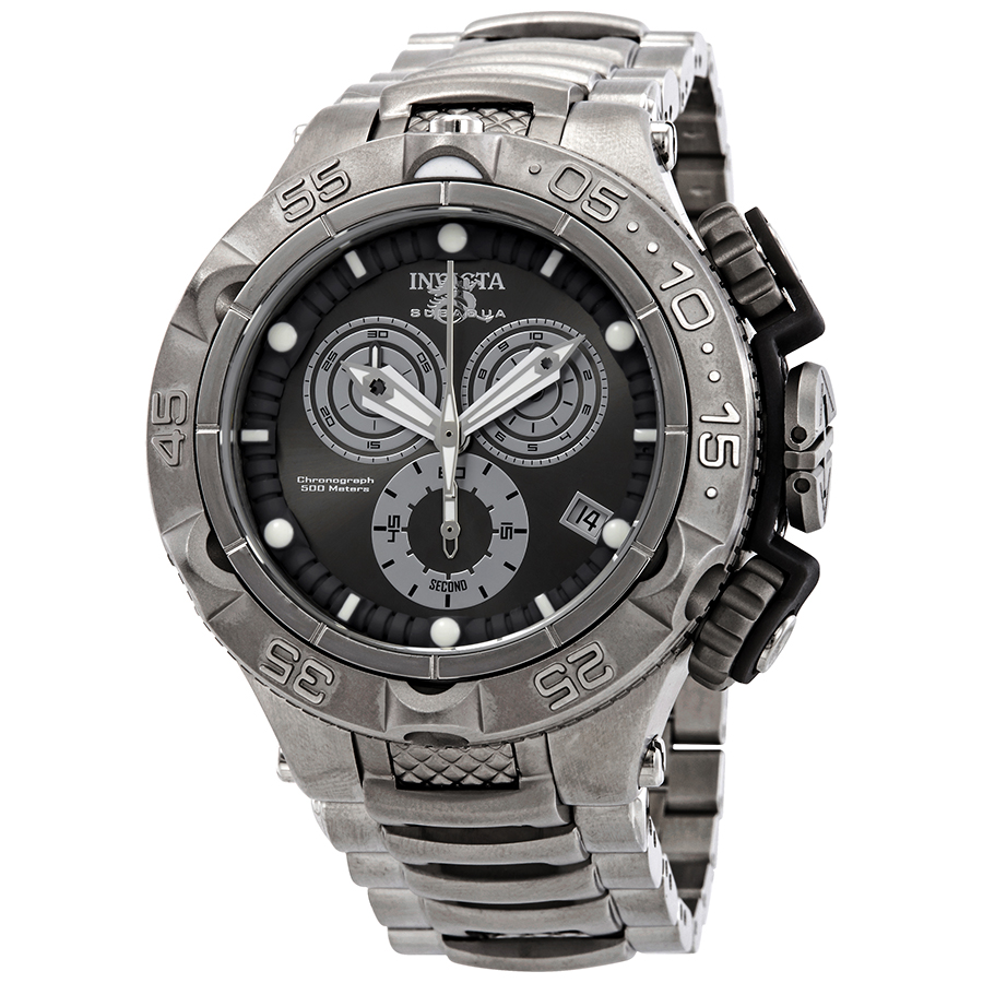 Silver-tone stainless steel case with a silver-tone stainless steel bracelet. Uni-directional rotating silver-tone stainless steel bezel. Black dial with silver-tone hands and index hour markers. Minute markers around the outer rim. Dial Type: Analog. Luminescent hands and markers. Date display at the 4 o'clock position. Chronograph - three sub-dials displaying: 60 second, 30 minute and 10 hour. ETA Caliber G10.211 quartz movement. Scratch resistant mineral crystal. Screw down crown. Solid case back. Round case shape. Case size: 50 mm. Band width: 28 mm. Fold over clasp. Water resistant at 500 meters / 1650 feet. Functions: chronograph, rattrapante, date, hour, minute, small second. Dive watch style. Watch label: Swiss Movt. Invicta Subaqua Chronograph Black Dial Mens Watch 27674.