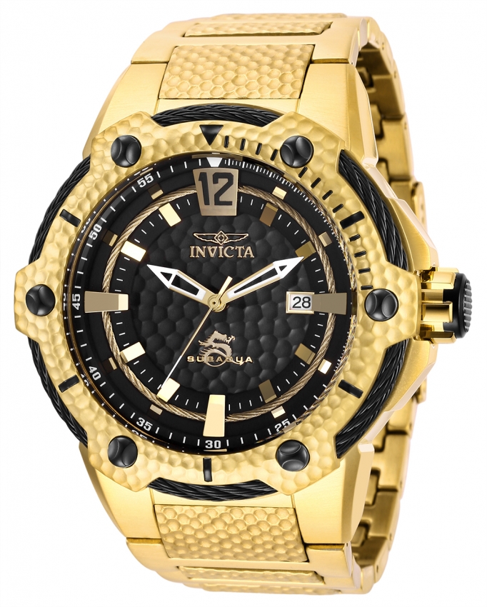 Gold-tone stainless steel case with a gold-tone stainless steel bracelet. Fixed gold-tone and black stainless steel bezel. Black dial with gold-tone hands and index hour markers. Minute markers around the outer rim. Dial Type: Analog. Date display at the 3 o'clock position. SII Caliber NH35A automatic movement with a 41-hour power reserve. Scratch resistant flame fusion crystal. Pull / push crown. Transparent case back. Round case shape. Case size: 53 mm. Band width: 30 mm, band length: 8.25 inches. Fold over clasp. Water resistant at 100 meters / 330 feet. Functions: date, hour, minute, second. Casual watch style. Watch label: Japan Movt. Invicta Subaqua Automatic Black Dial Mens Watch 28005.
