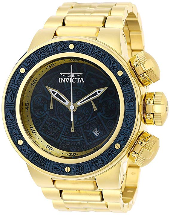 Gold-tone stainless steel case with a gold-tone stainless steel bracelet. Fixed blue stainless steel bezel. Blue dial with gold-tone hands. Minute markers around the outer rim. Dial Type: Analog. Luminescent hands. Date display between 4 and 5 o'clock position. Chronograph - sub-dials displaying: three - 60 second, 60 minute and 24 hour. Hattori Caliber VD53 quartz movement. Scratch resistant mineral crystal. Pull / push crown. Solid case back. Round case shape, case size: 52 mm, case thickness: 22 mm. Band width: 30 mm, band length: 8.25 inches. Fold over clasp. Water resistant at 200 meters / 660 feet. Functions: chronograph, date, GMT, second time zone, hour, minute, second. Sport watch style. Watch label: Japan Movt. Invicta Subaqua Aztec Chronograph Blue Dial Mens Watch 28252.