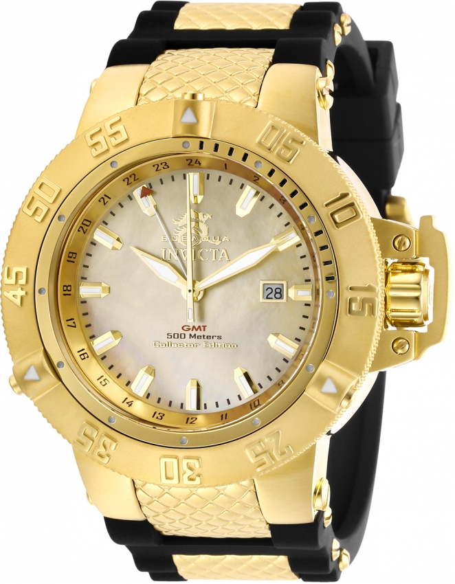 Gold-tone stainless steel case with a two-tone (black and gold-tone) stainless steel and silicone strap. Uni-directional rotating gold-tone stainless steel bezel. Gold-tone dial with gold-tone hands and index hour markers. Minute markers around the outer rim. Dial Type: Analog. Luminescent hands and markers. Date display at the 3 o'clock position. Ronda Caliber 515.24H quartz movement. Scratch resistant mineral crystal. Screw down crown. Solid case back. Round case shape, case size: 50 mm, case thickness: 17.9 mm. Band width: 29 mm, band length: 8.25 inches. Buckle clasp. Water resistant at 500 meters / 1650 feet. Functions: date, GMT, second time zone, hour, minute, second. Dive watch style. Watch label: Swiss Movt. Invicta Subaqua Quartz Gold Dial Mens Watch 29616.