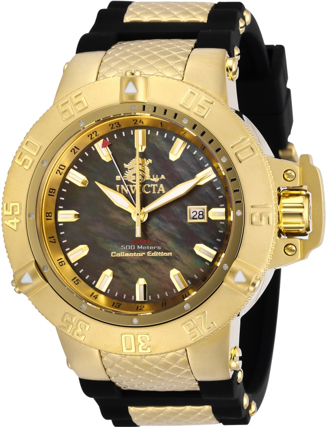 Gold-tone stainless steel case with a two-tone (black and gold-tone) stainless steel and silicone strap. Uni-directional rotating gold-tone stainless steel bezel. Brown dial with gold-tone hands and index hour markers. Minute markers around the outer rim. Dial Type: Analog. Luminescent hands and markers. Date display at the 3 o'clock position. Ronda Caliber 515.24H quartz movement. Scratch resistant mineral crystal. Screw down crown. Solid case back. Round case shape, case size: 50 mm, case thickness: 17.9 mm. Band width: 29 mm, band length: 8.25 inches. Buckle clasp. Water resistant at 500 meters / 1650 feet. Functions: date, GMT, second time zone, hour, minute, second. Dive watch style. Watch label: Swiss Movt. Invicta Subaqua Quartz Brown Dial Mens Watch 29618.