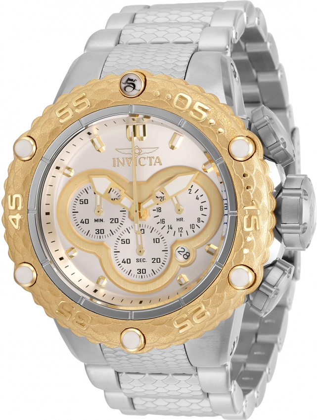 Two-tone (silver-tone and gold-tone) stainless steel case with a silver-tone stainless steel bracelet. Uni-directional rotating gold-tone stainless steel bezel. Silver and gold dial with gold-tone hands and index hour markers. Minute markers around the outer rim. Dial Type: Analog. Luminescent hands and markers. Date display between 4 and 5 o'clock position. Chronograph - three sub-dials displaying: 60 second, 60 minute and 24 hour. Hattori Caliber VD53 quartz movement. Scratch resistant mineral crystal. Screw down crown. Solid case back. Round case shape, case size: 51.2 mm, case thickness: 19.15 mm. Band width: 28.7 mm, band length: 8.25 inches. Fold over clasp. Water resistant at 500 meters / 1650 feet. Functions: chronograph, date, GMT, second time zone, hour, minute, second. Dive watch style. Watch label: Japan Movt. Invicta Subaqua Chronograph Quartz Mens Watch 31575.