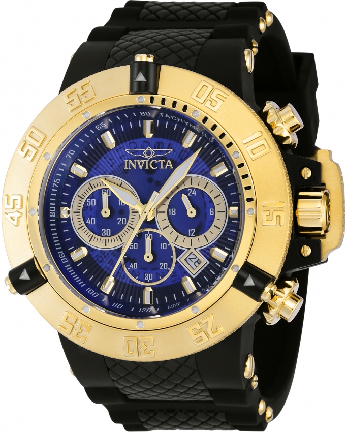Yellow gold-tone stainless steel case with a black slicone and plastic strap. Uni-directional rotating yellow gold-tone bezel. Blue dial with luminous yellow gold-tone hands and index hour markers. Minute markings. Tachymeter scale around the outer rim, minute markers around the outer rim. Dial Type: Analog. Luminescent hands and markers. Date display between the 4 and 5 o'clock positions. Chronograph - three sub-dials displaying: 60 second, 60 minute and 24 hour. Caliber VD53 quartz movement. Scratch resistant mineral crystal. Screw down crown. Solid case back. Round case shape. Case size: 50 mm. Case thickness: 21 mm. Band width: 28 mm. Tang clasp. Water resistant at 200 meters / 660 feet. Functions: chronograph, tachymeter, date, hour, minute, second. Subaqua Series. Casual watch style. Invicta Subaqua Chronograph Quartz Blue Dial Mens Watch 38997.
