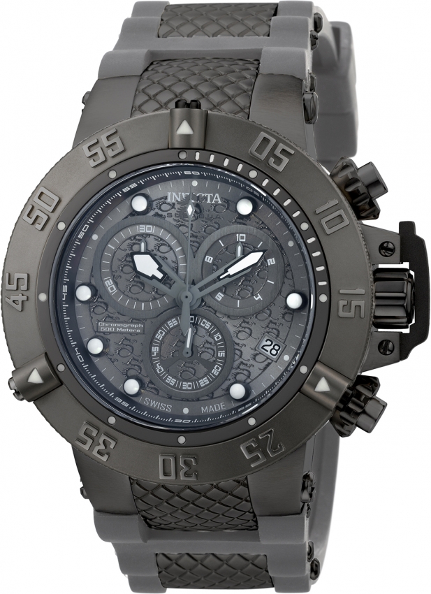 Black stainless steel case with a black silicone and stainless steel strap. Black stainless steel bezel. Black dial with black hands and index hour markers. Minute markers around the outer rim. Dial Type: Analog. Luminescent hands and markers. Date display at the 4 o'clock position. Chronograph - three sub-dials displaying: 60 second, 30 minute and 10 hour. ETA Caliber G10.211 quartz movement. Scratch resistant flame fusion crystal. Screw down crown. Solid case back. Round case shape, case size: 50 mm, case thickness: 21 mm. Band width: 29 mm, band length: 8.25 inches. Buckle clasp. Water resistant at 500 meters / 1650 feet. Functions: chronograph, rattrapante, date, hour, minute, small second. Dive watch style. Watch label: Swiss Movt. Invicta Subaqua Chronograph Black Dial Mens Watch 90116.