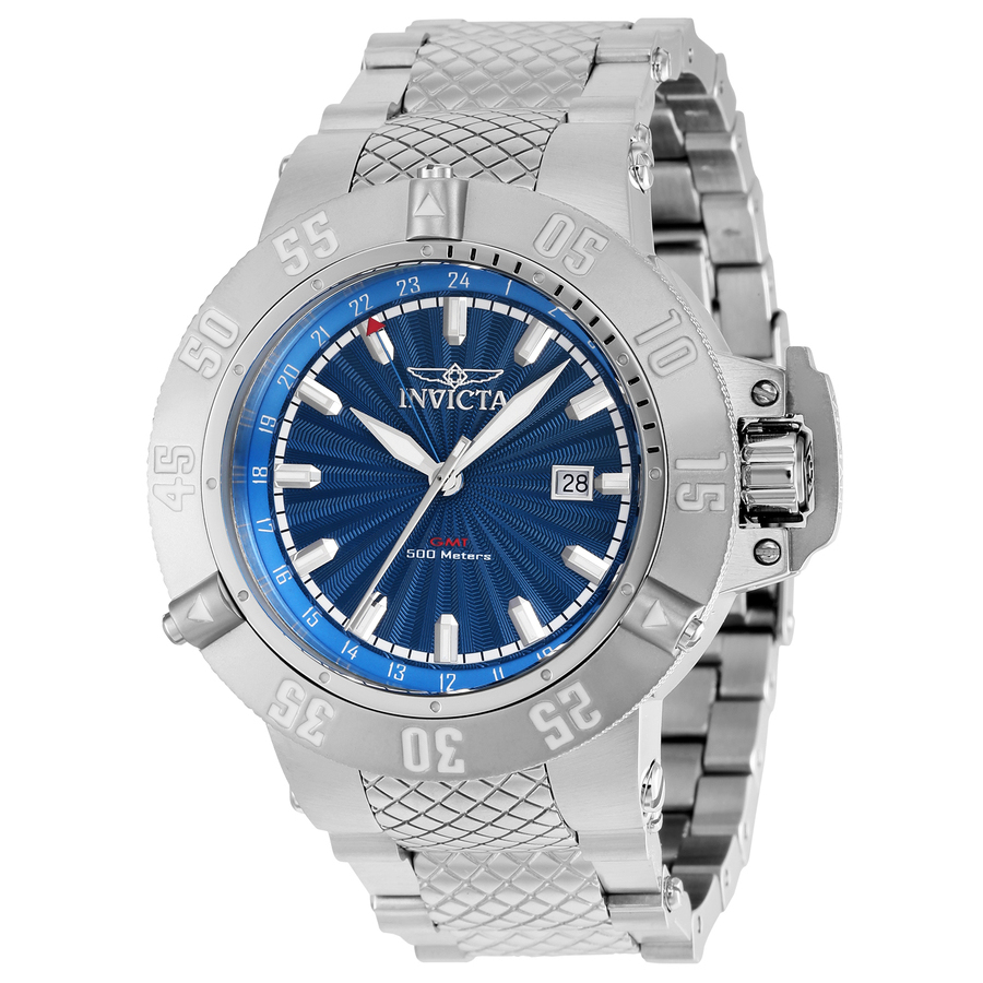 Stainless steel case with a stainless steel bracelet. Uni-directional rotating stainless steel bezel. Blue dial with luminous silver-tone hands and index hour markers. Minute markers. 24 hour (GMT) markers around the outer rim. Dial Type: Analog. Luminescent hands and markers. Date display at the 3 o'clock position. Ronda caliber 515.24H quartz movement. Scratch resistant Flame Fusion crystal. Screw down crown. Solid case back. Round case shape. Case size: 50 mm. Case thickness: 21 mm. Band width: 29 mm. Band length: 8.25 inches. Fold over clasp. Water resistant at 500 meters / 1650 feet. Functions: date, GMT, second time zone, hour, minute, second. Subaqua Series. Dive watch style. Watch label: Swiss Movt. Invicta Subaqua Zager Exclusive Blue Dial Mens Watch 37038.