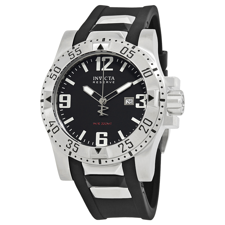 Stainless steel case with a black rubber bracelet. Black dial with luminous hands and index hour markers. Arabic numerals mark the 3, 6, 9, and 12 o'clock positions. Date display appears at the 3 o'clock position. Quartz movement. Scratch resistant flame-fusion crystal. Solid case back. Case diameter: 50 mm. Deployment clasp. Water resistant at 200 meters/ 660 feet. Functions: hours, minutes, seconds, date. Invicta Swiss Reserve Excursion Black Dial Mens Dive Watch 6252.