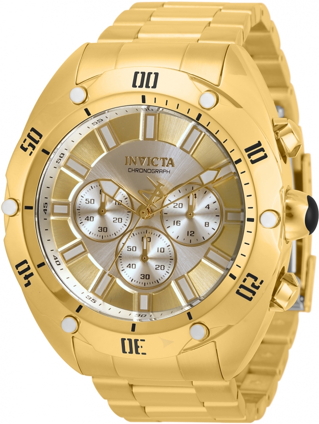 Gold-tone stainless steel case and bracelet. Two-tone (black and gold-tone) stainless steel bezel. Silver and gold dial with gold-tone hands and index hour markers. Minute markers around the outer rim. Dial Type: Analog. Luminescent hands and markers. Chronograph - three sub-dials displaying: 60 second, 60 minute and 24 hour. Hattori Caliber VD54 quartz movement. Scratch resistant Flame Fusion crystal. Pull / push crown. Solid case back. Round case shape, case size: 50 mm, case thickness: 18 mm. Band width: 26 mm, band length: 7.25 inches. Fold over clasp. Water resistant at 100 meters / 330 feet. Functions: chronograph, GMT, second time zone, hour, minute, second. Venom Series. Sport watch style. Watch label: Japan Movt. Invicta Venom Chronograph Quartz Mens Watch 33739.