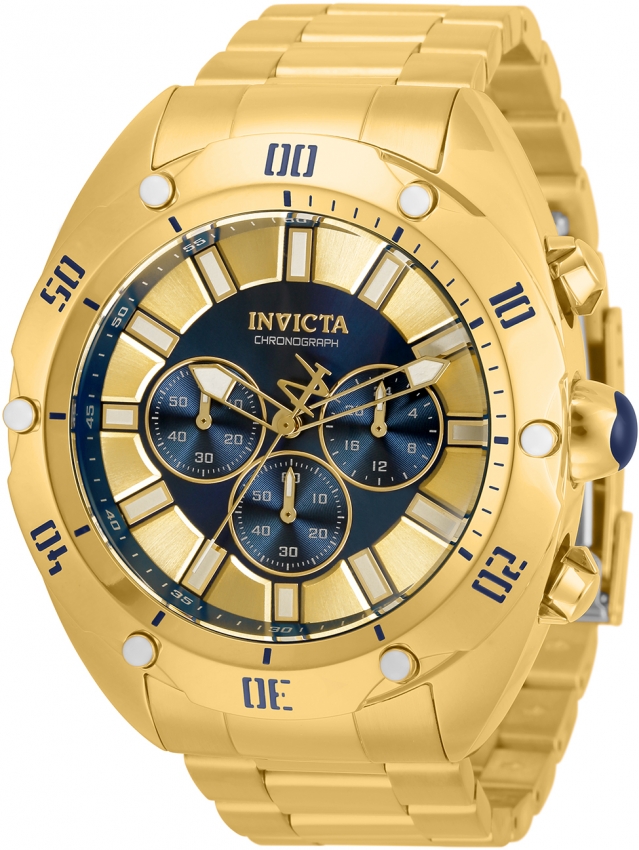 Gold-tone stainless steel case and bracelet. Gold and blue stainless steel bezel. Gold and blue dial with gold-tone hands and index hour markers. Minute markers around the outer rim. Dial Type: Analog. Luminescent hands and markers. Chronograph - three sub-dials displaying: 60 second, 60 minute and 24 hour. Hattori Caliber VD54 quartz movement. Scratch resistant Flame Fusion crystal. Pull / push crown. Solid case back. Round case shape, case size: 50 mm, case thickness: 18 mm. Band width: 26 mm, band length: 7.25 inches. Fold over clasp. Water resistant at 100 meters / 330 feet. Functions: chronograph, GMT, second time zone, hour, minute, second. Venom Series. Sport watch style. Watch label: Japan Movt. Invicta Venom Chronograph Quartz Mens Watch 33743.
