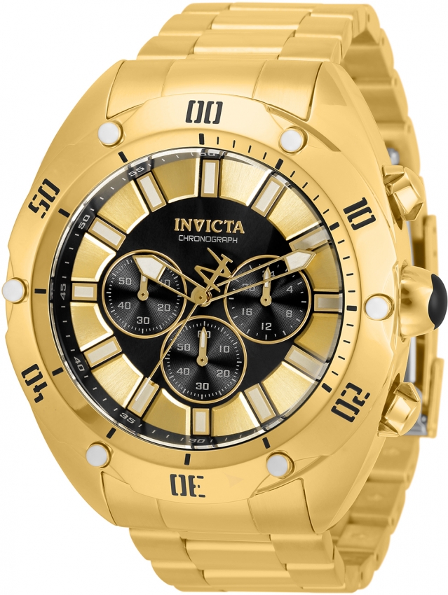 Gold-tone stainless steel case and bracelet. Two-tone (black and gold-tone) stainless steel bezel. Two-tone (black and gold-tone) dial with gold-tone hands and index hour markers. Minute markers around the outer rim. Dial Type: Analog. Luminescent hands and markers. Chronograph - three sub-dials displaying: 60 second, 60 minute and 24 hour. Hattori Caliber VD54 quartz movement. Scratch resistant Flame Fusion crystal. Pull / push crown. Solid case back. Round case shape, case size: 50 mm, case thickness: 18 mm. Band width: 26 mm, band length: 7.25 inches. Fold over clasp. Water resistant at 100 meters / 330 feet. Functions: chronograph, GMT, second time zone, hour, minute, second. Venom Series. Sport watch style. Watch label: Japan Movt. Invicta Venom Chronograph Quartz Mens Watch 33744.