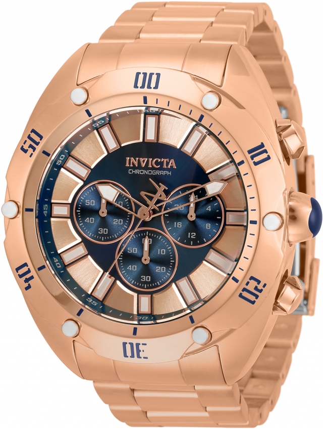 Rose gold-tone stainless steel case and bracelet. Rose gold and blue stainless steel bezel. Rose gold and blue dial with rose gold-tone hands and index hour markers. Minute markers around the outer rim. Dial Type: Analog. Luminescent hands and markers. Chronograph - three sub-dials displaying: 60 second, 60 minute and 24 hour. Hattori Caliber VD54 quartz movement. Scratch resistant Flame Fusion crystal. Pull / push crown. Solid case back. Round case shape, case size: 50 mm, case thickness: 18 mm. Band width: 26 mm, band length: 7.25 inches. Fold over clasp. Water resistant at 100 meters / 330 feet. Functions: chronograph, GMT, second time zone, hour, minute, second. Venom Series. Sport watch style. Watch label: Japan Movt. Invicta Venom Chronograph Quartz Mens Watch 33745.