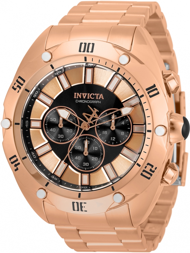 Rose gold-tone stainless steel case and bracelet. Fixed rose gold-tone bezel. Rose (black center) dial with rose gold-tone hands and index hour markers. Arabic numeral minute markers (at 5 minute intervals). Minute markers around the outer rim. Dial Type: Analog. Luminescent hands and markers. Chronograph - three sub-dials displaying: 60 second, 60 minute and 24 hour. Hattori caliber VD54 quartz movement. Scratch resistant Flame Fusion crystal. Pull / push crown. Solid case back. Round case shape. Case size: 50 mm. Case thickness: 18 mm. Band width: 26 mm. Band length: 7.25 inches. Fold over clasp. Water resistant at 100 meters / 330 feet. Functions: chronograph, GMT, second time zone, hour, minute, second. Venom Series. Sport watch style. Watch label: Japan Movt. Invicta Venom Chronograph Quartz Rose Dial Mens Watch 33747.