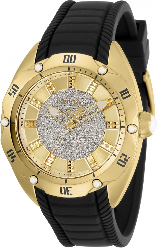 Gold-tone stainless steel case with a black silicone strap. Uni-directional rotating two-tone (black and gold-tone) stainless steel bezel. Silver and gold dial with gold-tone hands and index hour markers. Minute markers around the outer rim. Dial Type: Analog. Luminescent hands. Hattori Caliber PC21 quartz movement. Scratch resistant Flame Fusion crystal. Pull / push crown. Solid case back. Round case shape, case size: 38 mm, case thickness: 13 mm. Band width: 21 mm, band length: 7.50 inches. Buckle clasp. Water resistant at 100 meters / 330 feet. Functions: hour, minute, second. Venom Series. Casual watch style. Watch label: Japan Movt. Invicta Venom Quartz Ladies Watch 28430.