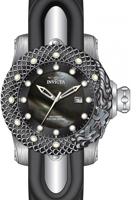 Two-tone (silver-tone and black) stainless steel case with a black and silver-tone silicone and stainless steel strap. Fixed black and silver-tone stainless steel bezel. Mother of pearl black dial with silver-tone hands and index hour markers. Minute markers around the outer rim. Dial Type: Analog. Luminescent hands and markers. Date display at the 3 o'clock position. SII Caliber NH35A Automatic movement, containing 24 Jewels, bitting at 21600 vph, and has a power reserve of approximately 41 hours. Scratch resistant mineral crystal. Screw down crown. Transparent see through case back. Round case shape, case size: 53.7 mm, case thickness: 22.3 mm. Band width: 26 mm, band length: 8.25 inches. Buckle clasp. Water resistant at 1000 meters / 3300 feet. Functions: date, hour, minute, second. Venom Series. Dive watch style. Watch label: Japan Movt. Invicta Venom Subaqua Dragon Automatic Mens Watch 33598.