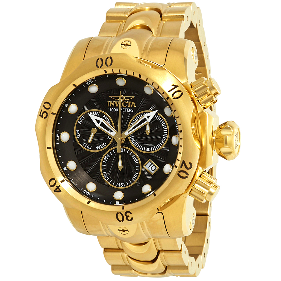Yellow gold-plated stainless steel case and bracelet. Uni-directional rotating gold-tone bezel. Black dial with yellow gold-tone skeleton hands and dot hour markers. Minute markers around the outer rim. Dial Type: Analog. Luminescent hands and markers. Date display between the 4 and 5 o'clock positions. Chronograph - two sub-dials displaying: 60 second and 30 minute. Day of the week sub-dial at the 9 o'clock position. Ronda caliber Z60 quartz movement. Scratch resistant mineral crystal. Screw down crown. Solid case back. Round case shape. Case size: 53.7 mm. Case thickness: 20 mm. Band width: 26 mm. Band length: 8.5 inches. Deployment clasp. Water resistant at 1000 meters / 3300 feet. Functions: chronograph, date, day, hour, minute, small second. Dive watch style. Watch label: Swiss Movt. Invicta Venom Chronograph Black Dial Mens Watch 25904.