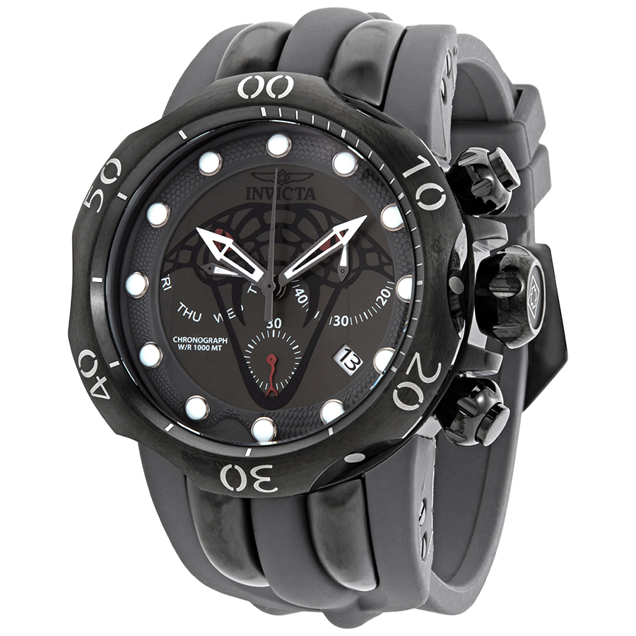 Black stainless steel case with a black silicone and stainless steel strap. Uni-directional rotating black stainless steel bezel. Black dial with silver-tone hands and index hour markers. Dial Type: Analog. Luminescent hands and markers. Date display between 4 and 5 o'clock position. Chronograph - three sub-dials displaying: week, 60 second, 30 minute. Ronda Caliber Z60 FE quartz movement. Scratch resistant mineral crystal. Screw down crown. Solid case back. Round case shape, case size: 53.7 mm, case thickness: 21 mm. Band width: 36 mm, band length: 9 inches. Buckle clasp. Water resistant at 1000 meters / 3300 feet. Functions: chronograph, date, day, hour, minute, second. Dive watch style. Watch label: Swiss Movt. Invicta Venom Viper Chronograph Black Dial Mens Watch 28384.