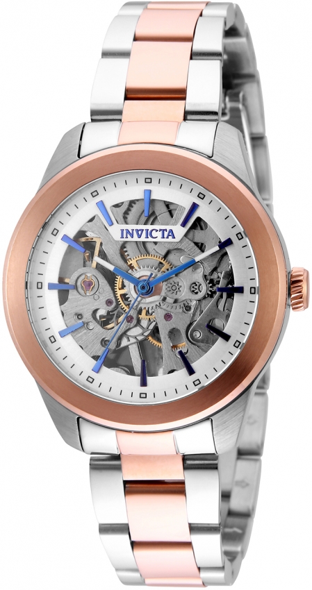 Silver-tone stainless steel case with a silver-tone and rose gold stainless steel bracelet. Fixed rose gold-tone stainless steel bezel. Silver-tone dial with blue hands and index hour markers. Minute markers around the outer rim. Dial Type: Analog. Luminescent hands and markers. Caliber STBL-005BS(S.S.) automatic movement. Scratch resistant flame fusion crystal. Pull / push crown. Transparent case back. Round case shape, case size: 34 mm, case thickness: 13.5 mm. Band width: 16 mm, band length: 7 inches. Fold over clasp. Water resistant at 100 meters / 330 feet. Functions: hour, minute, second. Casual watch style. Invicta Vintage Automatic Silver Dial Ladies Watch 32310.