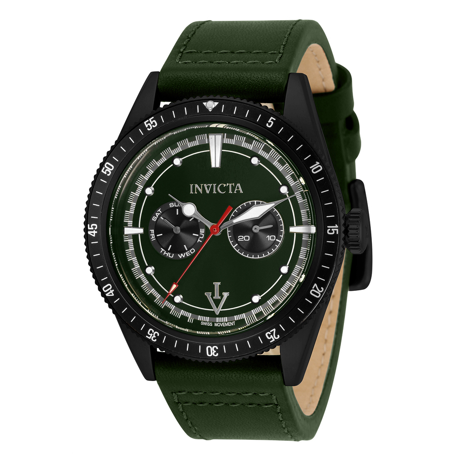 Black-plated stainless steel case with a green leather strap. Uni-directional rotating black-plated bezel with an inlaid black ring. Green dial with luminous silver-tone hands and index hour markers. Minute markers around the outer rim. Dial Type: Analog. Luminescent hands and markers. Two multi-function sub-dials displaying: seconds and date. Ronda caliber 706 quartz movement. Scratch resistant Flame Fusion crystal. Pull / push crown. Solid case back. Round case shape. Case size: 44 mm. Case thickness: 13 mm. Band width: 22 mm. Band length: 7.50 inches. Tang clasp. Water resistant at 100 meters / 330 feet. Functions: date, day, hour, minute, second. Vintage Series. Casual watch style. Watch label: Swiss Movt. Invicta Vintage Green Dial Mens Watch 33533.