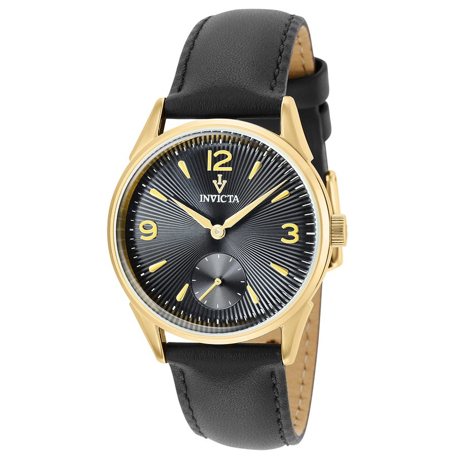Yellow gold-tone stainless steel case with a black leather strap. Fixed yellow gold-tone bezel. Black dial with yellow gold-tone hands and index hour markers. Arabic numerals appear at the 3, 9 and 12 o'clock positions. Minute markers around the outer rim. Dial Type: Analog. Small seconds sub-dial. TMI caliber VD78 quartz movement. Scratch resistant Flame Fusion crystal. Pull / push crown. Solid case back. Round case shape. Case size: 34 mm. Case thickness: 10.1 mm. Band width: 18 mm. Band length: 7 inches. Tang clasp. Water resistant at 100 meters / 330 feet. Functions: hour, minute, small second. Vintage Series. Casual watch style. Watch label: Japan Movt. Invicta Vintage Quartz Black Dial Mens Watch 37078.