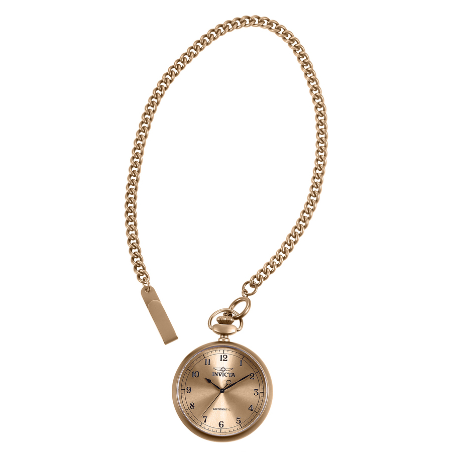 Khaki stainless steel case with a khaki stainless steel chain. Fixed gold-tone bezel. Khaki dial with black hands and Arabic numeral hour markers. Minute markers around the outer rim. Dial Type: Analog. SII Caliber NH35A Automatic movement, containing 24 Jewels, bitting at 21600 vph, and has a power reserve of approximately 41 hours. Scratch resistant mineral crystal. Pull / push crown. Transparent case back. Round case shape. Case size: 50 mm. Case thickness: 15.5 mm. Band width: 7.5 mm. Band length: 18.50 inches. Water resistant at 30 meters / 100 feet. Functions: hour, minute, second. Vintage Series. Casual watch style. Watch label: Japan Movt. Invicta Vintage Rose Gold-tone Dial Mens Pocket Watch 35648.