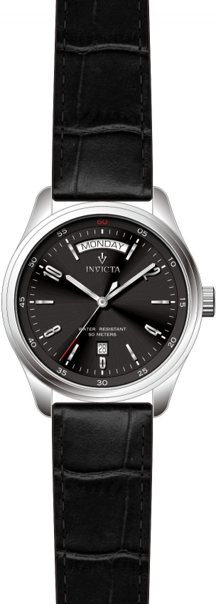 Silver-tone stainless steel case with a black leather strap. Fixed silver-tone stainless steel bezel. Black dial with silver-tone hands and Arabic numeral and index hour markers. Minute markers around the outer rim. Dial Type: Analog. Luminescent hands. Date display at the 6 o'clock position. Hattori Caliber VJ55 quartz movement. Scratch resistant flame fusion crystal. Pull / push crown. Solid case back. Round case shape, case size: 40 mm, case thickness: 10 mm. Band width: 20 mm, band length: 8.75 inches. Buckle clasp. Water resistant at 50 meters / 165 feet. Functions: date, day, hour, minute, second. Casual watch style. Watch label: Japan Movt. Invicta Vintage Quartz Black Dial Mens Watch 31256.
