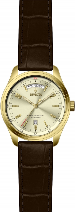 Yellow gold-tone stainless steel case with a brown leather strap. Fixed yellow gold-tone bezel. Champagne dial with luminous yellow gold-tone hands and alternating Arabic numeral and index hour markers. Minute markers. Arabic numeral minute markers (at 5 minute intervals) around the outer rim. Dial Type: Analog. Luminescent hands. Date display above the 6 o'clock position. Day of the week dispay centered on the 12 o'clock position. Hattori caliber VJ55 quartz movement. Scratch resistant Flame Fusion crystal. Pull / push crown. Solid case back. Round case shape. Case size: 40 mm. Case thickness: 10 mm. Band width: 20 mm. Band length: 8.75 inches. Tang clasp. Water resistant at 50 meters / 165 feet. Functions: date, day, hour, minute, second. Vintage Series. Casual watch style. Watch label: Japan Movt. Invicta Vintage Quartz Champagne Dial Mens Watch 31257.