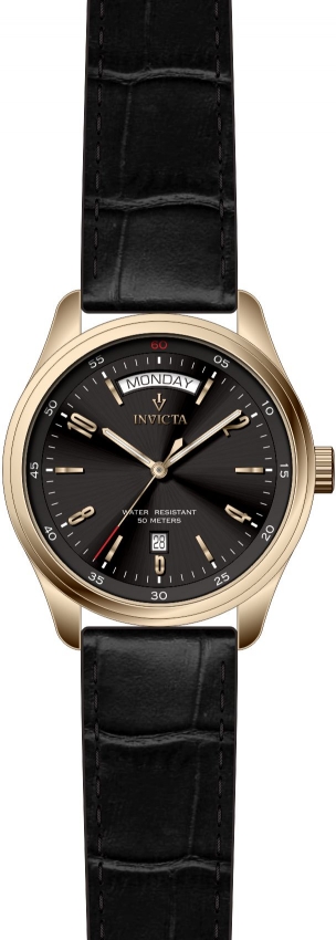 Rose gold-tone stainless steel case with a black leather strap. Fixed rose gold-tone bezel. Black dial with luminous rose gold-tone hands and alternating Arabic numeral and index hour markers. Minute markers. Arabic numeral minute markers (at 5 minute intervals) around the outer rim. Dial Type: Analog. Luminescent hands. Date display above the 6 o'clock position. Day of the week dispay centered on the 12 o'clock position. Hattori caliber VJ55 quartz movement. Scratch resistant Flame Fusion crystal. Pull / push crown. Solid case back. Round case shape. Case size: 40 mm. Case thickness: 10 mm. Band width: 20 mm. Band length: 8.75 inches. Tang clasp. Water resistant at 50 meters / 165 feet. Functions: date, day, hour, minute, second. Vintage Series. Casual watch style. Watch label: Japan Movt. Invicta Vintage Quartz Black Dial Black Leather Mens Watch 31260.