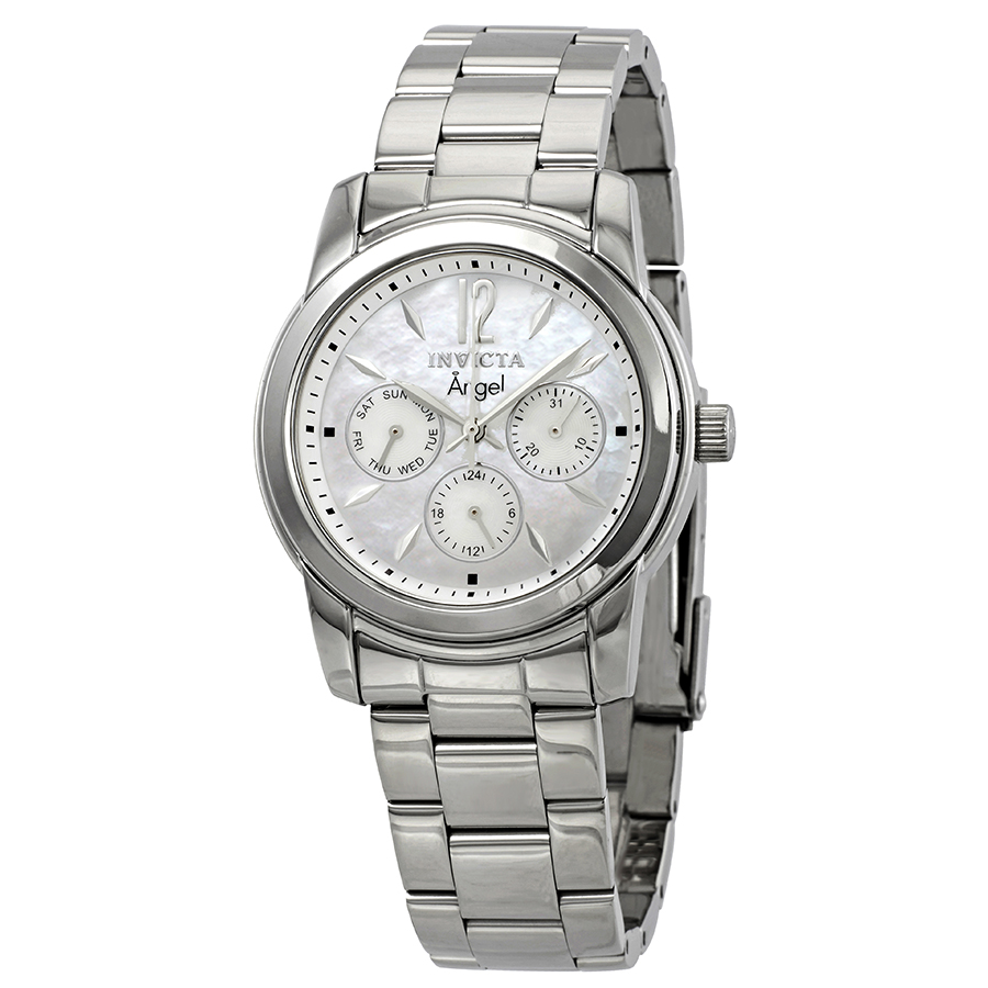 Stainless steel case with a stainless steel bracelet. Fixed stainless steel bezel. Mother of pearl dial with silver-tone hands and index hour markers. An Arabic numeral appears at the 12 o'clock positions. Minute markers around the outer rim. Dial Type: Analog. Luminescent hands and markers. Three multi-function sub-dials displaying: 24 hour, date and day of the week. ISA caliber 9238/1970 quartz movement. Scratch resistant flame fusion crystal. Pull / push crown. Solid case back. Round case shape. Case size: 38 mm. Case thickness: 11 mm. Band width: 20 mm. Band length: 7.85 inches. Fold over clasp with a safety release. Water resistant at 50 meters / 165 feet. Functions: date, day, hour, minute, second, 24 hours. Casual watch style. Invicta Angel Multi-Function Mother of Pearl Dial Ladies Watch 0463.