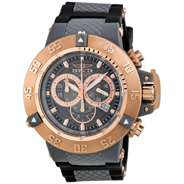 Grey plastic case with a black rubber strap with grey textured center. Uni-directional rotating 18kt gold-plated bezel. Grey transparent dial with luminous gold-tone hands and index hour markers. Minute markers. tachymeter around the outer rim. Dial Type: Analog. Luminescent hands and markers. Date display at the 4 o'clock position. Chronograph - three sub-dials displaying: 60 second, 30 minute and 1/10th of a second. Hattori caliber VD53 quartz movement. Scratch resistant flame fusion crystal. Screw down with protective lever crown. Solid case back. Round case shape, case size: 50 mm, case thickness: 17 mm. Band width: 29 mm, band length: 8 inches. Tang clasp. Water resistant at 200 meters / 660 feet. Functions: hours, minutes, seconds, date, chronograph. Sport watch style. Invicta Subaqua Noma III Grey Dial Black Rubber Mens Watch 0932.