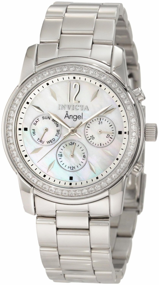Stainless steel case with a stainless steel bracelet. Fixed stainless steel bezel set with crystals. Mother of pearl dial with silver-tone hands and index hour markers. An Arabic numeral marks the 12 o'clock position. Minute markers around the outer rim. Dial Type: Analog. Luminescent hands and markers. Three multi-function sub-dials displaying: 24 hour, date and day of the week. ISA caliber 9238/1970 quartz movement. Scratch resistant flame fusion crystal. Pull / push crown. Solid case back. Round case shape, case size: 38 mm, case thickness: 12 mm. Band width: 20 mm, band length: 8.25 inches. Fold over clasp with a safety release. Water resistant at 50 meters / 165 feet. Functions: GMT, second time zone, date, day, hour, minute, second. Additional Info: suitable for swimming and showering. Dress watch style. Invicta Angel Multi-Function Mother of Pearl Stainless Steel Ladies Watch 11768.