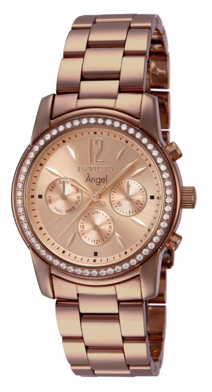 Brown ion-plated stainless steel case and bracelet. Fixed brown ion-plated bezel set with crystals. Pink dial with rose gold-tone hands and index hour markers. Arabic numeral marks the 12 o'clock position. Minute markers around the outer rim. Dial Type: Analog. Three multi-function sub-dials displaying: 24 hour, date and the day of the week. Quartz movement. Scratch resistant flame fusion crystal. Pull / push crown. Solid case back. Case diameter: 38 mm. Case thickness: 11 mm. Round case shape. Band width: 20 mm. Band length: 8.25 inches. Fold over clasp with safety release. Water resistant at 50 meters / 165 feet. Functions: date, day, hour, minute, second, 24 hour. Casual watch style. Invicta Angel Multi-Function Pink Dial Brown Ion-plated Ladies Watch 11773.