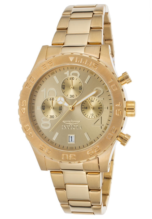 Gold-tone stainless steel case with a gold-tone stainless steel bracelet. Uni-directional rotating rose gold-plated stainless steel bezel. Gold-tone dial with gold-tone hands and Arabic numeral hour markers. Minute markers around the outer rim. Dial Type: Analog. Date display at the 6 o'clock position. Chronograph - sub-dials displaying: three - 60 second, 60 minute and 24 hour. SII Caliber VD52 quartz movement. Scratch resistant mineral crystal. Pull / push crown. Solid case back. Round case shape, case size: 40 mm, case thickness: 12 mm. Band width: 20 mm, band length: 8.25 inches. Water resistant at 50 meters / 165 feet. Functions: chronograph, date, hour, minute, second. Casual watch style. Invicta Specialty Gold Chronograph Ladies Watch 1279.