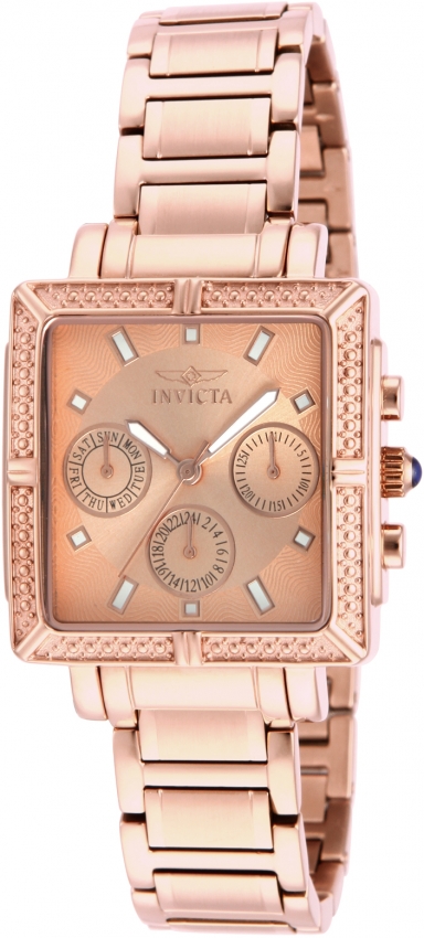 18kt rose gold ion-plated stainless steel case and bracelet. Fixed 18kt rose gold ion-plated bezel. Rose dial with luminous rose gold-tone hands and index hour markers. Dial Type: Analog. Luminescent hands and markers. Date display at 3 o'clock, day display at 9 o'clock position. Three multi-function sub-dials displaying: 24 hour, date and day of the week. Swiss parts ISA 9238 Quartz quartz movement. Scratch resistant mineral crystal. Pull / push crown. Solid case back. Square case shape. Case size: 33 mm. Case thickness: 12 mm. Band width: 16 mm. Band length: 8 inches. Deployment clasp with a push button release. Water resistant at 30 meters / 100 feet. Functions: date, day, hour, minute, second. Casual watch style. Invicta Wildflower Rose Dial Rose Gold Ion-plated Ladies Watch 14872.