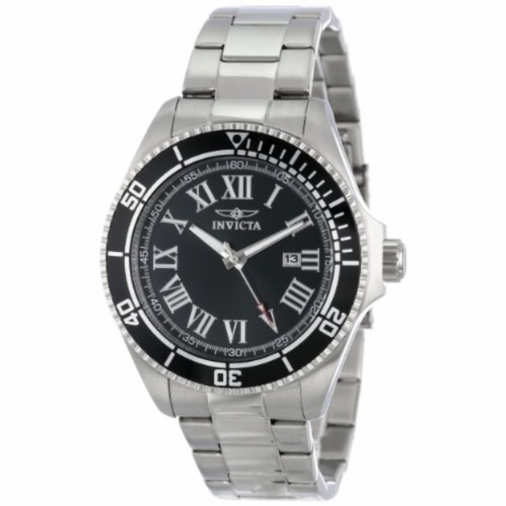 Stainless steel case with a stainless steel bracelet. Uni-directional rotating stainless steel bezel with black top ring. Black dial with silver-tone hands and Roman numeral hour markers. Minute markers around the outer rim. Dial Type: Analog. Luminescent hands and markers. Date display at the 3 o'clock position. Quartz movement. Scratch resistant flame fusion crystal. Pull / push crown. Solid case back. Case diameter: 46 mm. Case thickness: 13 mm. Round case shape. Band width: 20 mm. Band length: 9.4 inches. Fold over clasp with safety release. Water resistant at 100 meters / 330 feet. Casual watch style. Invicta Pro Diver Black Dial Stainless Steel Mens Watch 14998.