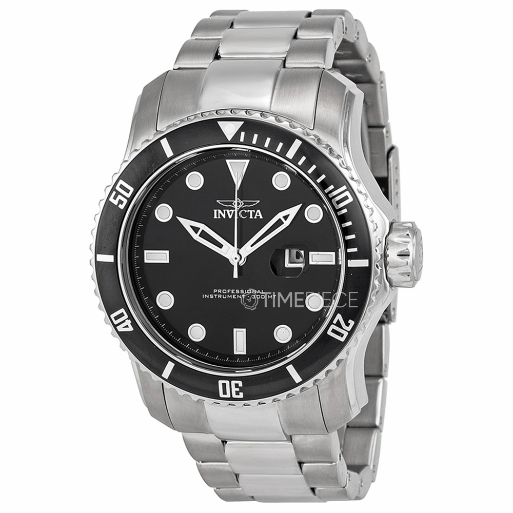 Stainless steel case with a stainless steel bracelet. Uni-directional rotating stainless steel bezel with black ion-plated top ring. Black dial with silver-tone skeleton hands and dot hour markers. Minute markers around the outer rim. Dial Type: Analog. Luminescent hands and markers. Date display at the 3 o'clock position. Quartz movement. Scratch resistant flame fusion crystal. Screw down crown. Solid case back. Case diameter: 48.8 mm. Case thickness: 17 mm. Round case shape. Band width: 26 mm. Deployment clasp with push button release. Water resistant at 300 meters / 1000 feet. Casual watch style. Invicta Pro Diver Blue Dial Stainless Steel Mens Watch 15076.