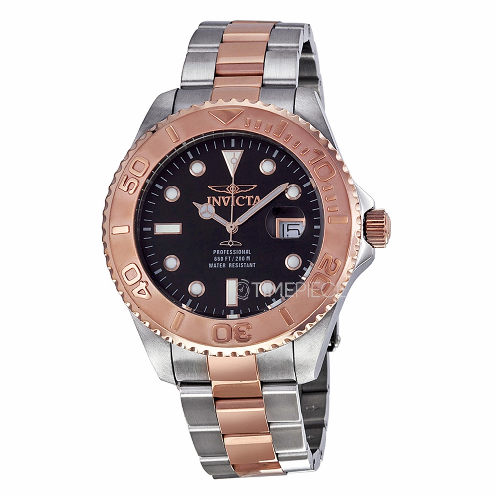 Stainless steel case with a two-tone (silver-tone and 18kt rose gold ion-plated) bracelet. Uni-directional rotating 18kt rose gold ion-plated bezel. Black dial with luminous gold-tone hands and dot hour markers. Minute markers around the outer rim. Dial Type: Analog. Luminescent hands and markers. Date display at the 3 o'clock position. Quartz movement. Scratch resistant mineral crystal. Pull / push crown. Solid case back. Case diameter: 47 mm. Case thickness: 14 mm. Round case shape. Band width: 22 mm. Band length: 8.85 inches. Fold over clasp with safety release. Water resistant at 200 meters / 660 feet. Functions: date, hour, minute, second. Casual watch style. Invicta Pro Diver Balck Dial Two-tone Mens Watch 15188.