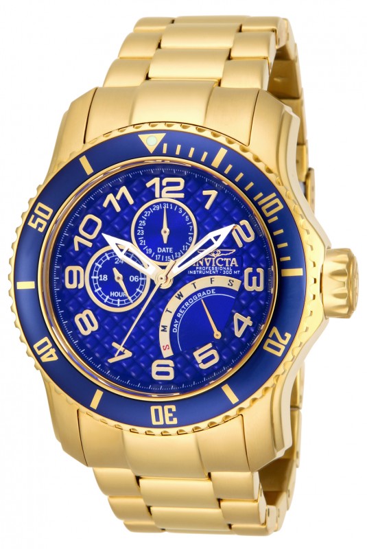 Gold ion-plated stainless steel case and bracelet. Uni-directional rotating gold ion-plated bezel with blue top ring. Blue dial with skeleton hands and Arabic numeral hour markers. Minute markers around the outer rim. Dial Type: Analog. Luminescent hands and markers. Three multi-function displays showing: 24 hours, date and day of the week. Quartz movement. Scratch resistant mineral crystal. Screw down crown. Solid case back. Case diameter: 48.8 mm. Case thickness: 18 mm. Round case shape. Band width: 26 mm. Band length: 6.85 inches. Fold over clasp with safety release. Water resistant at 300 meters / 1000 feet. Functions: date, day, hour, minute, second, 24 hour. Casual watch style. Invicta Pro Diver Multi-Function Blue Dial Gold Ion-plated Mens Watch 15342.