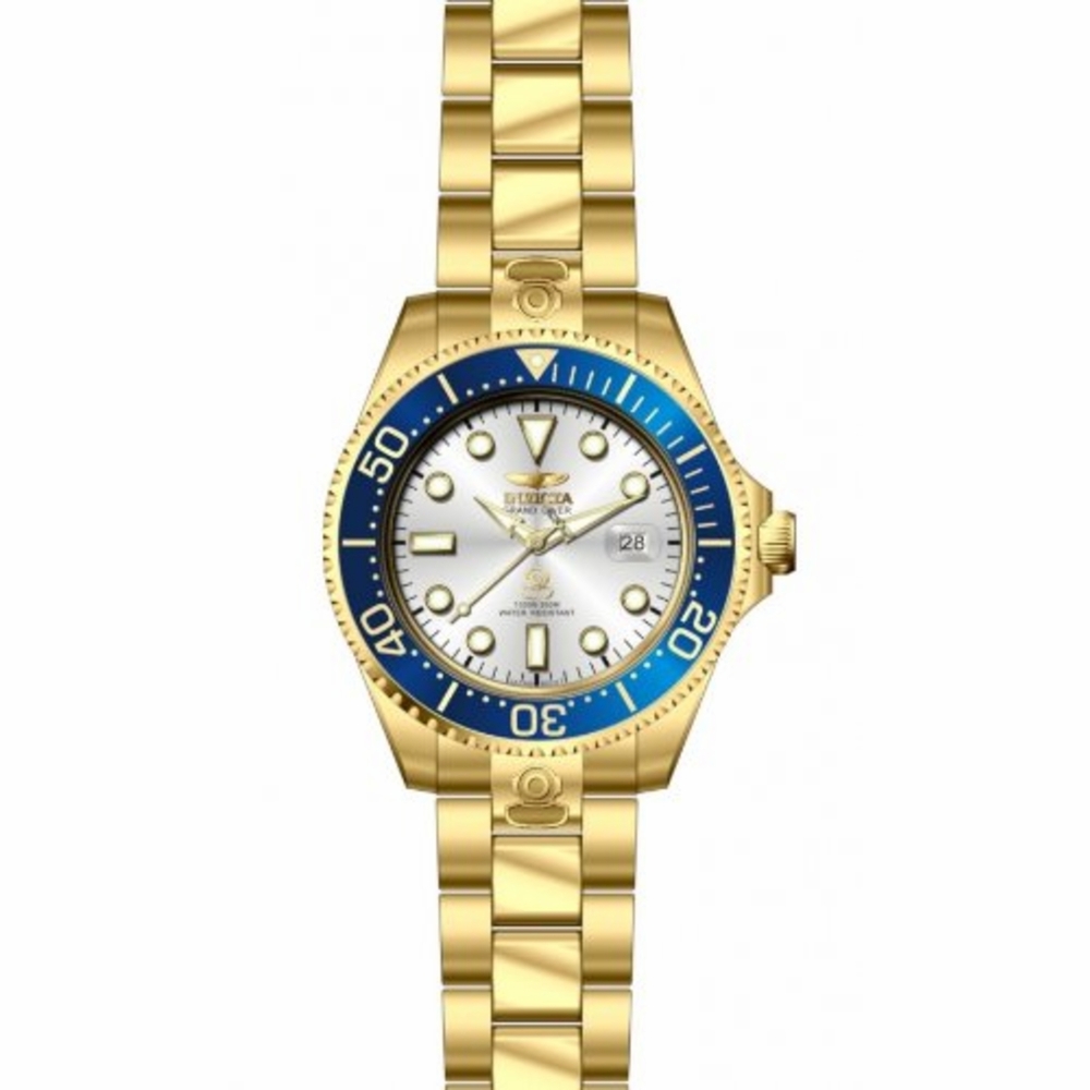 18kt gold ion-plated stainless steel case and bracelet. Uni-directional rotating 18kt gold ion-plated with bezel. Silver dial with luminous silver-tone hands and dot hour markers. Minute markers around the outer rim. Dial Type: Analog. Luminescent hands and markers. Date display at the 3 o'clock position. Automatic movement. Scratch resistant mineral crystal. Pull / push crown. Skeleton case back. Case diameter: 47 mm. Round case shape. Fold over clasp with safety release. Water resistant at 300 meters / 1000 feet. Functions: date, hour, minute, second. Casual watch style. Invicta Grand Diver Automatic Silver Dial 18kt Gold Ion-plated 15845.