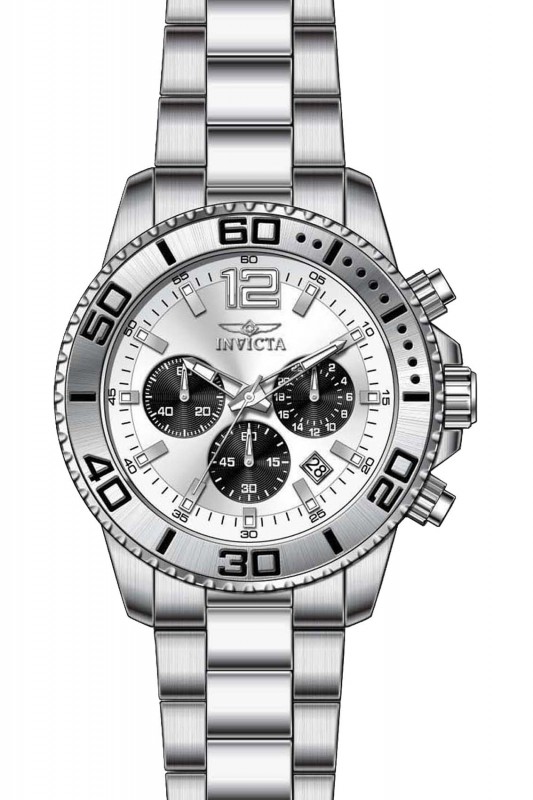 Silver-tone stainless steel case with a silver-tone stainless steel bracelet. Fixed arabic numeral coin edge silver-tone stainless steel bezel. Silver dial with silver-tone luminous skeleton hands and index hour markers. Arabic numeral marks the 12 o'clock position. minute markers around the outer rim. Dial Type: Analog. Luminescent hands and markers. Date display between 4 and 5 o'clock position. Chronograph - three sub-dials displaying: 60 second, 60 minute and 24 hour. Hattori Caliber VD53 quartz movement. Scratch resistant flame fusion crystal. Pull / push crown. Solid case back. Round case shape, case size: 45 mm, case thickness: 13 mm. Band width: 22 mm, band length: 8.75 inches. Fold over with safety release clasp. Water resistant at 50 meters / 165 feet. Functions: chronograph, date, GMT, second time zone, hour, minute, second. Pro Diver Series. Casual watch style. Watch label: Japan Movt. Invicta Pro Diver Chronograph Silver Dial Stainless Steel Mens Watch 17395.