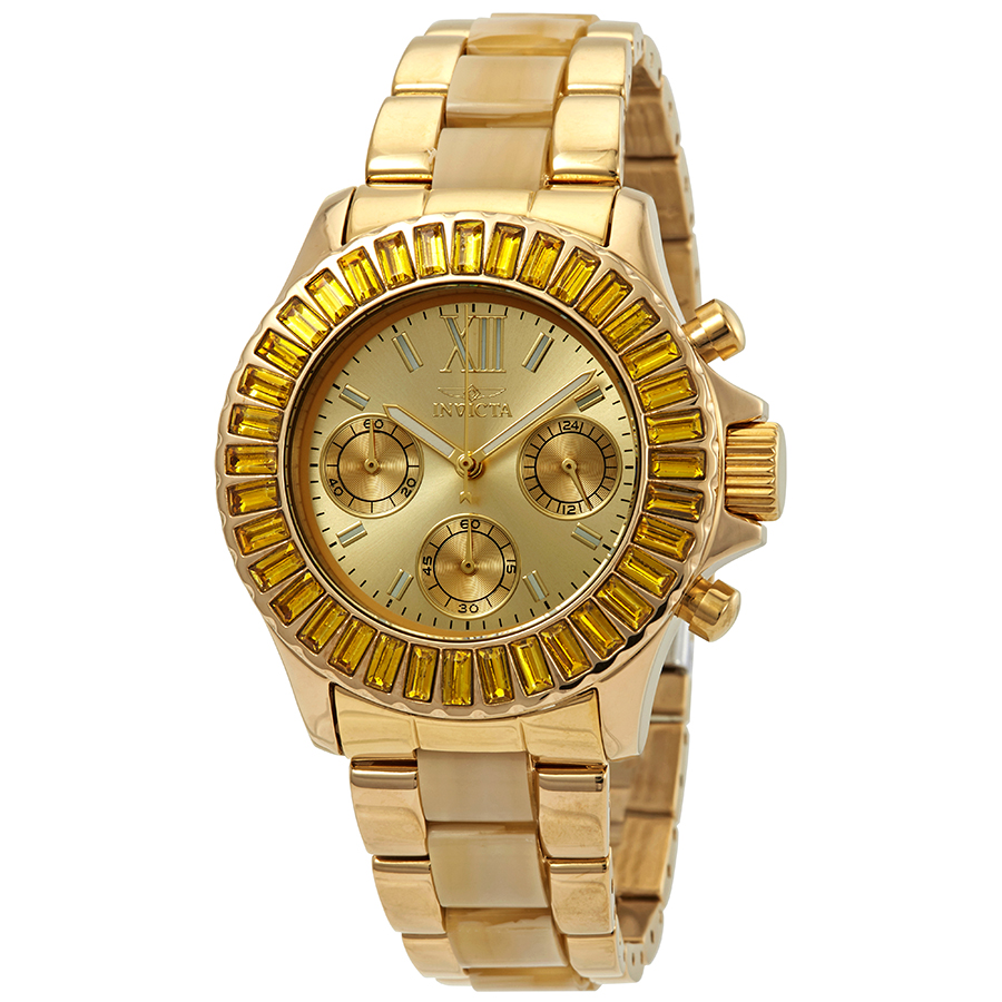 Gold-plated stainless steel case with a gold-plated stainless steel bracelet with horne acetate center link. Fixed gold-plated bezel set with baguette crystals. Gold dial with luminous gold-tone hands and index hour markers. A Roman numeral appears at the 12 o'clock positions. Minute markers around the outer rim. Dial Type: Analog. Luminescent hands and markers. Three multi-function sub-dials displaying: 24 hour, date and day of the week. ISA caliber 9240 quartz movement. Scratch resistant flame fusion crystal. Pull / push crown. Solid case back. Round case shape. Case size: 38 mm. Case thickness: 12 mm. Band width: 20 mm. Fold over clasp with a safety release. Water resistant at 100 meters / 330 feet. Functions: date, day, hour, minute, second, 24 hour. Casual watch style. Invicta Angels Multi-Function Gold Dial Gold-plated and Horne Acetate Ladies Watch 17492.