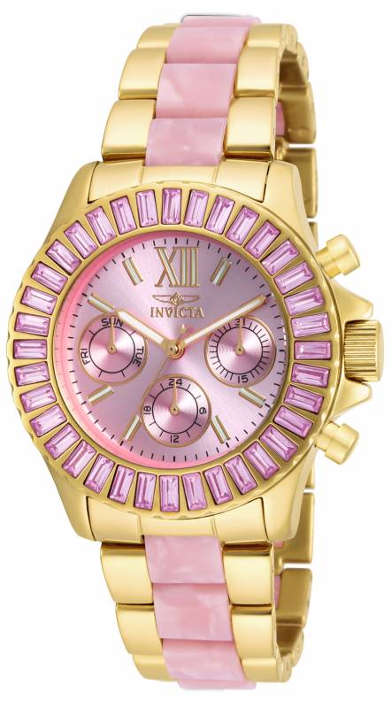 Gold-plated stainless steel case with a gold-plated stainless steel bracelet with pink acetate center links. Fixed gold-plated bezel set with baguette crystals. Pink dial with luminous gold-tone hands and index hour markers. Roman numeral appears at the 12 o'clock position. Minute markers around the outer rim. Dial Type: Analog. Luminescent hands and markers. Three multi-function sub-dials displaying: date, day of the week and 24 hour. ISA caliber 9241 quartz movement. Scratch resistant Flame Fusion crystal. Pull / push crown. Solid case back. Round case shape. Case size: 38 mm. Case thickness: 12 mm. Band width: 20 mm. Fold over clasp with a safety release. Water resistant at 100 meters / 330 feet. Functions: date, day, hour, minute, second, 24 hour. Angel Series. Casual watch style. Invicta Angels Multi-Function Pink Dial Gold-plated and Pink Acetate Ladies Watch 17493.