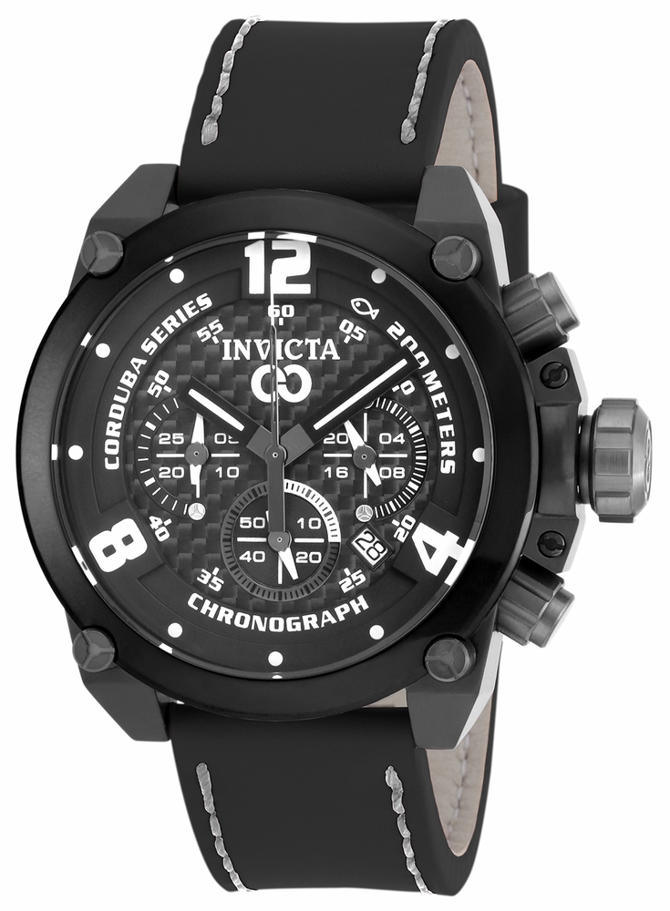 Black ion-plated stainless steel case with a black leather strap. Fixed black ion-plated bezel. Black carbon fiber dial with black hands and dot hour markers. Arabic numerals mark the 4, 8 and 12 o'clock positions. Dial Type: Analog. Luminescent hands and markers. Date display between 4 and 5 o'clock positions. Chronograph - three sub-dials displaying: 60 second, 30 minute and 24 hour. Quartz movement. Scratch resistant mineral crystal. Pull / push crown. Solid case back. Case diameter: 50 mm. Case thickness: 16 mm. Round case shape. Band width: 24 mm. Band length: 8.65 inches. Tang clasp. Water resistant at 200 meters / 660 feet. Functions: chronograph, date, hour, minute, second. Casual watch style. Invicta Corduba Chronograph Black Carbon Fiber Dial Black Leather Mens Watch 18935.