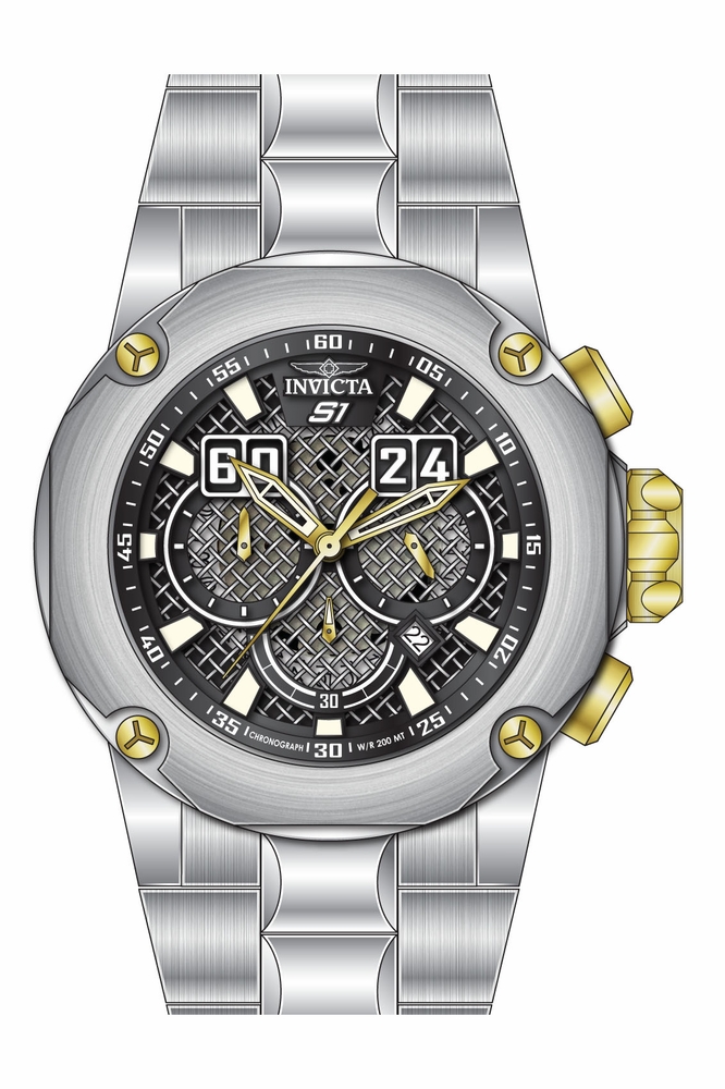 Stainless steel case with a stainless steel bracelet. Fixed stainless steel bezel. Black dial with luminous gold-tone hands and index hour markers. Minute markers around the outer rim. Dial Type: Analog. Luminescent hands and markers. Date display between 4 and 5 o'clock positions. Chronograph - three sub-dials displaying: 60 second, 60 minute and 24 hour. Quartz movement. Scratch resistant mineral crystal. Pull / push crown. Solid case back. Case diameter: 52 mm. Case thickness: 22 mm. Round case shape. Band width: 34 mm. Band length: 8.25 inches. Fold over clasp with safety release. Water resistant at 200 meters / 660 feet. Functions: chronograph, date, hour, minute, second. Casual watch style. Invicta S1 Rally Chronograph Black Dial Stainless Steel Mens Watch 19429.