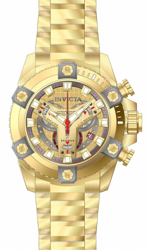 Yellow gold ion-plated stainless steel case and bracelet. Fixed yellow gold ion-plated bezel. Yellow gold dial with luminous yellow gold-tone hands and index hour markers. Minute markers around the outer rim. Dial Type: Analog. Luminescent hands and markers. Date display at the 4 o'clock position. Chronograph - three displays: 60 second, 30 minute and 1/10th of a second. Quartz movement. Scratch resistant flame fusion crystal. Screw down crown. Solid case back. Case diameter: 56 mm. Round case shape. Band width: 31 mm. Band length: 9 inches. Deployment clasp with push button release. Water resistant at 200 meters / 660 feet. Functions: chronograph, date, hour, minute, second. Casual watch style. Invicta Coalition Forces Chronograph Yellow Gold Dial Yellow Gold Ion-plated Mens Watch 19581.