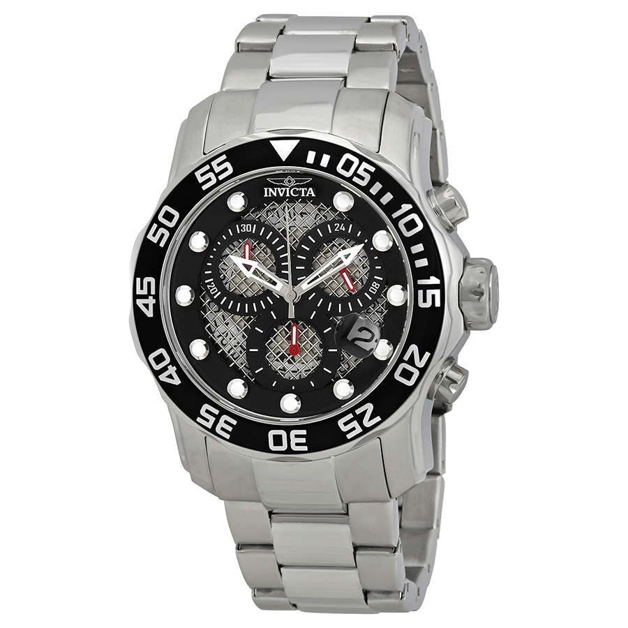 Silver-tone stainless steel case with a silver-tone stainless steel bracelet. Uni-directional rotating silver-tone stainless steel with a black top ring bezel. Black dial with skeleton hands and dot hour markers. Dial Type: Analog. Luminescent hands and markers. Date display at the 4 o'clock position. Chronograph - sub-dials displaying: three - 60 second, 30 minute and 24 hour. TMI Caliber VR34A quartz movement. Scratch resistant mineral crystal. Screw down crown. Solid case back. Round case shape, case size: 49 mm, case thickness: 17 mm. Band width: 26 mm, band length: 8.25 inches. Fold over with safety release clasp. Water resistant at 300 meters / 1000 feet. Functions: chronograph, date, hour, minute, second. Additional Info: suitable for mixed-gas diving. Sport watch style. Watch label: Japan Movt. Invicta Pro Diver Chronograph Black Dial Mens Watch 19836.