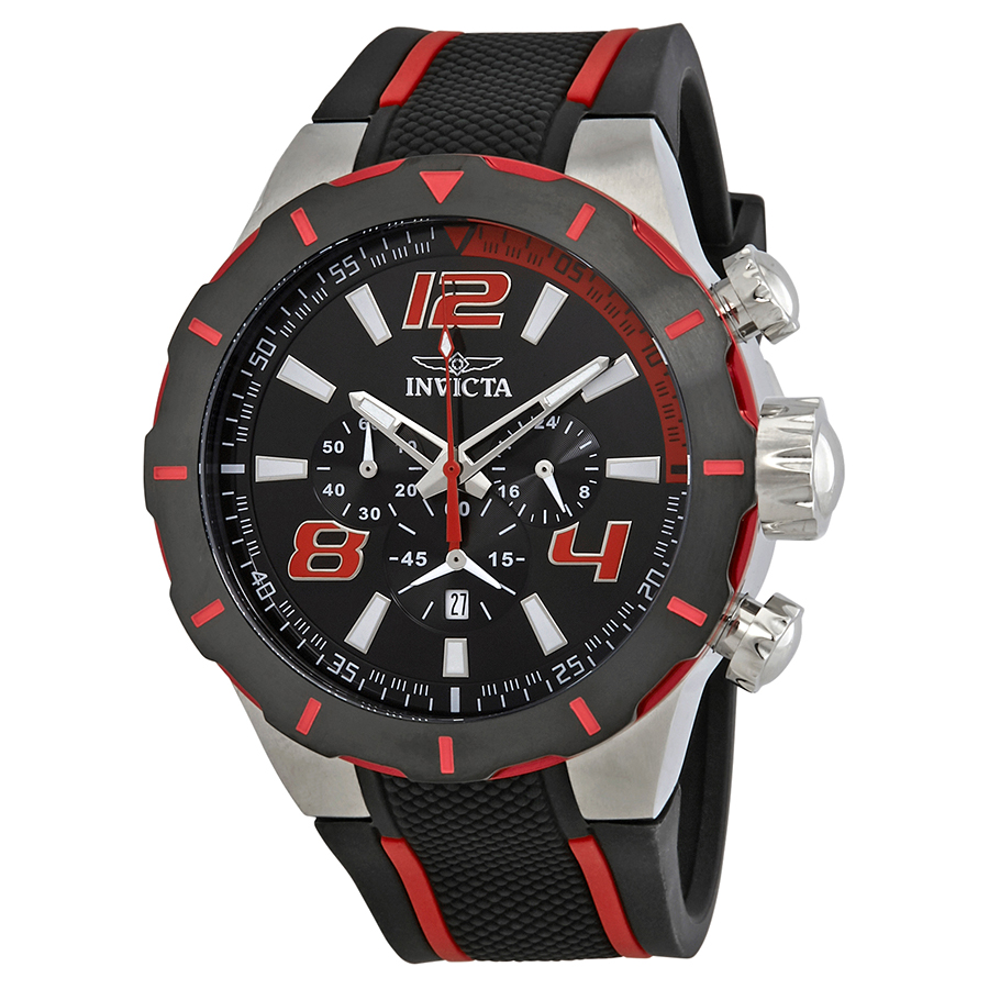 Silver-tone stainless steel case with a black polyurethane strap with a red stripe. Fixed black aluminum bezel with a red rim. Black dial with luminous silver-tone hands and index hour markers. Arabic numerals mark the 4, 8 and 12 o'clock positions. Minute markers around the outer rim. Dial Type: Analog. Luminescent hands and markers. Date display at the 6 o'clock position. Chronograph - three sub-dials displaying: 60 second, 60 minute and 24 hour. Hattori caliber VD53 quartz movement. Scratch resistant flame fusion crystal. Pull / push crown. Solid case back. Case size: 53 mm. Case thickness: 13 mm. Round case shape. Band width: 32 mm. Tang clasp. Water resistant at 100 meters / 330 feet. Functions: chronograph, date, GMT, second time zone, hour, minute, second. Casual watch style. Watch label: Japan Movt. Invicta S1 Rally Chronograph Black Dial Mens Watch 20105.