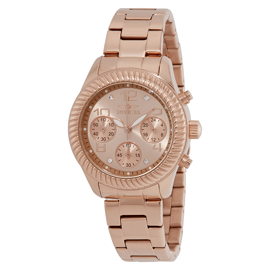 Rose gold-plated stainless steel case and bracelet. Fixed rose gold-plated bezel. Rose dial with luminous rose gold-tone hands and alternating Arabic numeral and crystal hour markers. Minute markers around the outer rim. Dial Type: Analog. Luminescent hands and markers. Chronograph - three sub-dials displaying: 60 second, 60 minute and 24 hour. Caliber: VD54 quartz movement. Scratch resistant flame fusion crystal. Pull / push crown. Solid case back. Case size: 36 m. Case thickness: 11 mm. Round case shape. Band width: 18 mm. Band length: 7,25 inches. Fold over clasp with a safety release. Water resistant at 100 meters / 330 feet. Functions: hour, minute, second. Casual watch style. Invicta Angel Chronograph Rose Dial Ladies Watch 20267.