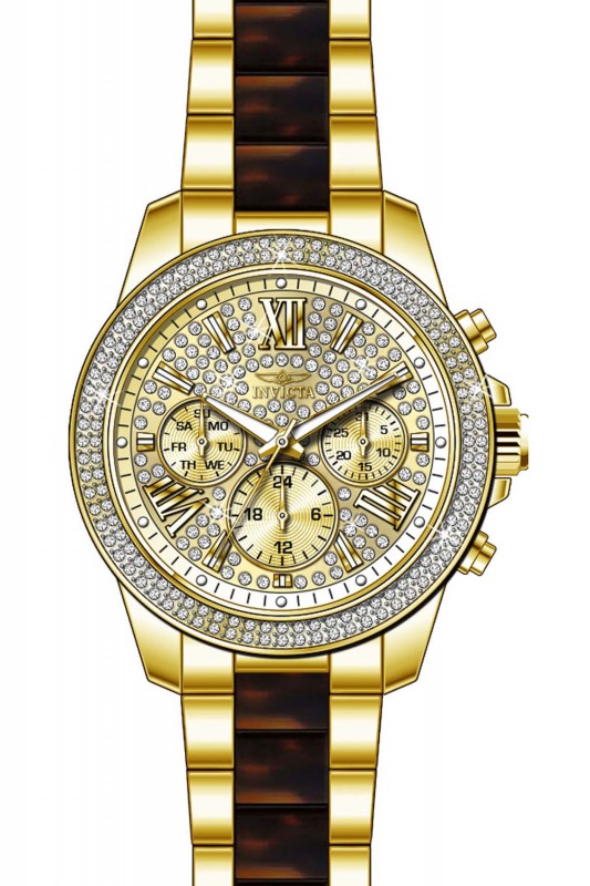 Gold-plated stainless steel case with a gold-plated stainless steel and brown tortoise-shell bracelet. Fixed gold-plated bezel set with crystals. Gold crystal-set dial with luminous gold-tone hands and index hour markers. Roman numerals mark the 4, 8 and 12 o'clock positions. Minute markers around the outer rim. Dial Type: Analog. Luminescent hands and markers. Three multi-function sub-dials displaying: 24 hour, date and day of the week. Quartz movement. Scratch resistant flame fusion crystal. Pull / push crown. Solid case back. Case diameter: 38 mm. Round case shape. Band width: 18 mm. Band length: 7.6 inches. Fold over clasp with safety release. Water resistant at 100 meters / 330 feet. Functions: date, day, hour, minute, second, 24 hour. Casual watch style. Invicta Angel Multi-Function Gold Crystal-set Gold-plated Ladies Watch 20509.