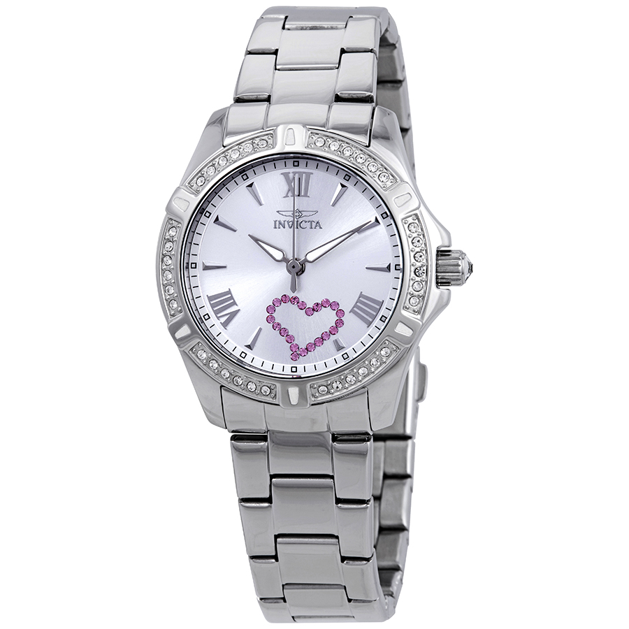 Stainless steel case with a stainless steel bracelet. Fixed stainless steel bezel set with crystals. Silver dial with luminous silver-tone hands and index hour markers. Roman numerals mark the 4, 8 and 12 o'clock positions. Minute markers around the outer rim. Dial Type: Analog. Luminescent hands and markers. Caliber: PC21 quartz movement. Scratch resistant flame fusion crystal. Pull / push crown. Solid case back. Case size: 35 mm. Case thickness: 11 mm. Round case shape. Band width: 18 mm. Band length: 7.7 inches. Fold over clasp with a safety release. Water resistant at 100 meters / 330 feet. Functions: hour, minute, second. Casual watch style. Invicta Angel Silver Dial Stainless Steel Ladies Watch 21416.