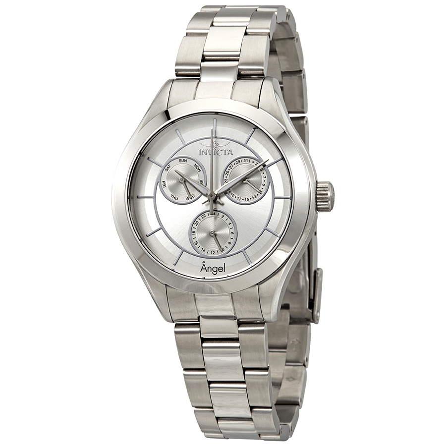 Stainless steel case with a stainless steel bracelet. Fixed stainless steel bezel. Silver-tone dial with luminous silver-tone hands and index hour markers. Dial Type: Analog. Luminescent hands. Date display at the 3 o'clock position. Three multi-function sub-dials displaying: date, day of the week and 24-hour. Caliber VH68 quartz movement. Scratch resistant flame fusion crystal. Pull / push crown. Solid case back. Round case shape. Case size: 40 mm. Case thickness: 12 mm. Band width: 18 mm. Band length: 8.25 inches. Fold over clasp with a safety release. Water resistant at 50 meters / 165 feet. Functions: date, day, GMT, second time zone, hour, minute, second. Additional Info: in general, suitable for short periods of recreational swimming, but not diving or snorkeling. Casual watch style. Invicta Angel Multi-Function Silver Dial Ladies Watch 21693.