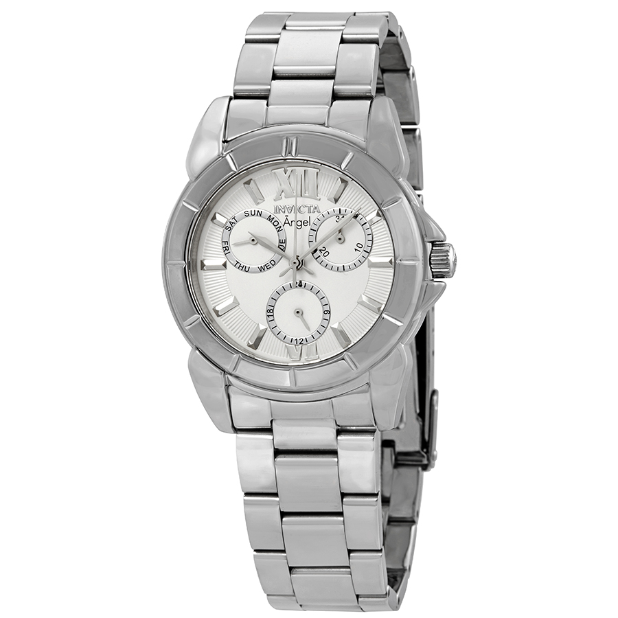Stainless steel case with a stainless steel bracelet. Fixed stainless steel bezel. Silver dial with silver-tone hands and index hour markers. Roman numerals mark the 6 and 12 o'clock positions. Dial Type: Analog. Luminescent hands and markers. Three multi-function sub-dials displaying: 24 hour, date and day of the week. Caliber VH68 quartz movement. Scratch resistant flame fusion crystal. Pull / push crown. Solid case back. Round case shape. Case size: 38 mm. Case thickness: 11 mm. Band width: 20 mm. Band length: 8.25 inches. Fold over clasp with a safety release. Water resistant at 50 meters / 165 feet. Functions: date, day, hour, minute, second. Additional Info: in general, suitable for short periods of recreational swimming, but not diving or snorkeling. Casual watch style. Invicta Angel Multi-Function Silver Dial Ladies Watch 21699.